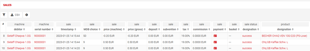 Ensure that all steps listed in this manual have been completed chronologically. Check: The price and product settings for the cup in the vending machine control system itself, as well as the following settings in Vensoft, must be configured correctly: The vending machine type, the vending machine, and the vending machine's inventory, including the product ingredient, recipe, and the product "cup", must be entered correctly. After successfully completing all settings, the transaction records must be checked for accuracy. These can be found under Transaction Data ⇒ Sales.
