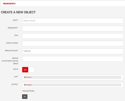 In the next step, the product ingredient "cup" can be created. If multiple cup sizes are available, a separate "cup" product ingredient must be created for each cup size (e.g., "large cup" and "small cup"). Save with "OK."