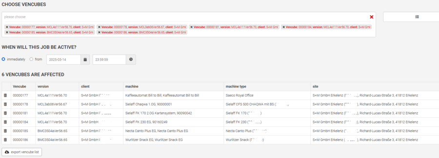 In the "Select Vencubes" field, enter the serial numbers of the Vencubes you want to update. Then select and apply all desired Vencube serial numbers. A list of the selected Vencubes will then open below, along with the corresponding information for review. You can remove individual Vencubes that you do not want to receive an update using the trash can in the first column.