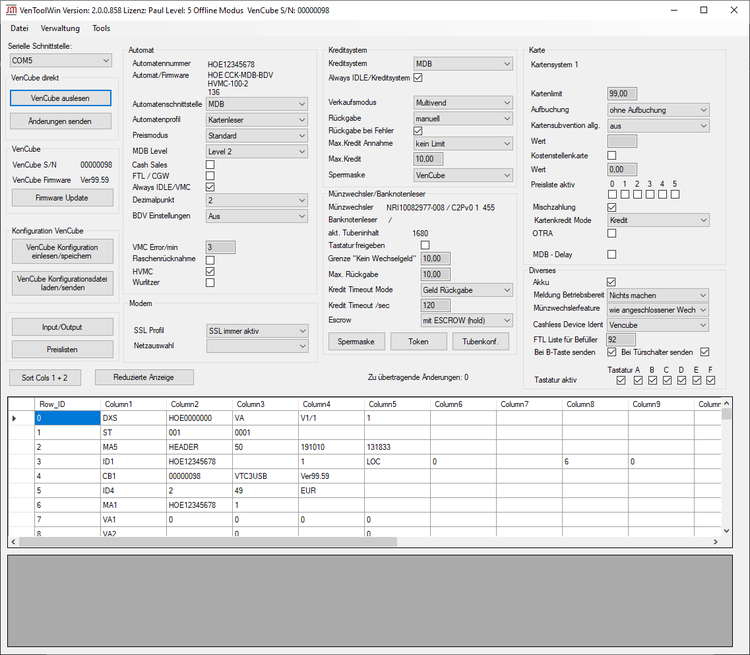 Hier wird der VenCube direkt ausgelesen und die Konfigurationsdatei im Programm angezeigt.