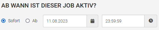 Unter "Ab wann ist dieser Job aktiv?" kann der Zeitpunkt ausgewählt werden, wann der Job ausgeführt werden soll. Enweder "Sofort" oder zu einem festgelegten Zeitpunkt in der Zukunft, einstellbar über "Ab" mit der Auswahl von Datum und Uhrzeit.