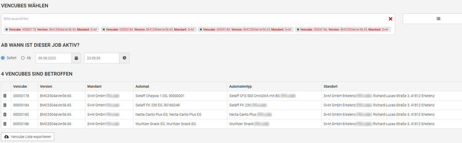 In das Feld "Vencubes wählen" die Seriennummern der Vencubes eingeben, deren gewünschte EVA Liste Sie empfangen wollen. Anschließend alle gewünschten Vencube Seriennummern auswählen und übernehmen. Daraufhin öffnet sich darunter eine Liste, der ausgewählten Vencubes, mit dazugehörigen Informationen zur Kontrolle. Über den Mülleimer in der ersten Spalte können einzelne Vencubes, die doch keine EVA Liste senden sollen, wieder entfernt werden.