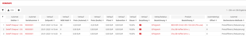 Sicherstellen, dass alle hier in der Anleitung aufgeführten Schritte chronologisch durchlaufen wurden. Zur Kontrolle: Die Preis- und Produkteinstellungen für den Becher in der Automatensteuerung selber, und folgende Einstellungen in der Vensoft, müssen vorgenommen worden sein: Der Automat und die Bestückung im Automaten, inklusive Produktzutat, Rezeptur und dem Produkt "Becher", müssen korrekt eingepflegt sein. Nach erfolgreichem Abschluss aller Einstellungen, müssen noch die Transaktionsdatensätze auf Korrektheit überprüft werden. Zu finden sind Diese unter unter Bewegungsdaten ⇒ Verkäufe.