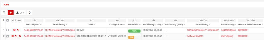 Der Updateverlauf kann online beobachtet werden. Ein Firmware Update besteht aus insgesamt 8 Datenpaketen. Diese Pakete werden nach und nach heruntergeladen und in dem Jobfortschritt entsprechend angezeigt: 13% ⇒ 25% ⇒ 38% ⇒ 50% ⇒ 63% ⇒ 75% ⇒ 88% ⇒ 100%. Sobald das Update vollständig heruntergeladen wurde, beginnt der Vencube zu flashen. Erkennbar wird dies dadurch, dass LED1 und LED2 des Vencubes in einem Lauflicht rot und grün hin und her blinken.
